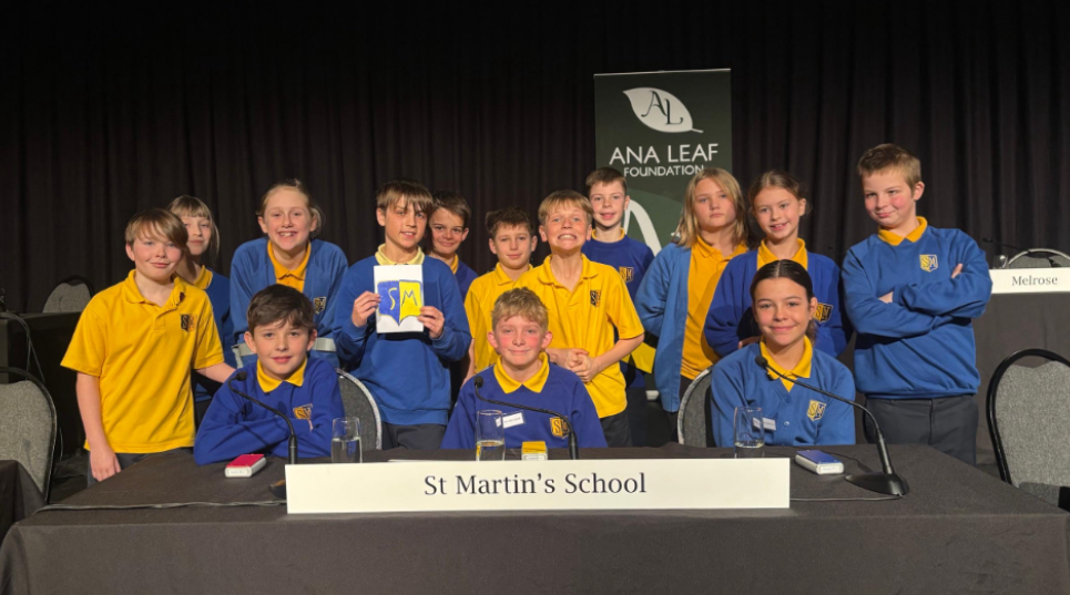 Year 5 and 6 with their winning trophy for 'Le Navet Énorme' at the French Eisteddfod