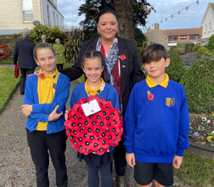 Year 6 School Councillors laying a wreath at the parish memorial for Remembrance Sunday.